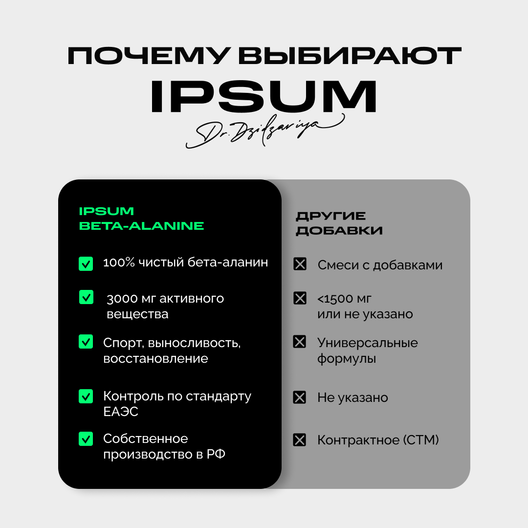 Это не просто аминокислота. Это топливо для ваших самых сильных тренировок. Beta-Alanine IPSUM — добавка, которая даёт мышцам возможность идти дальше, когда остальные уже выдыхаются. Больше мощи. Дольше темп. Быстрее прогресс.