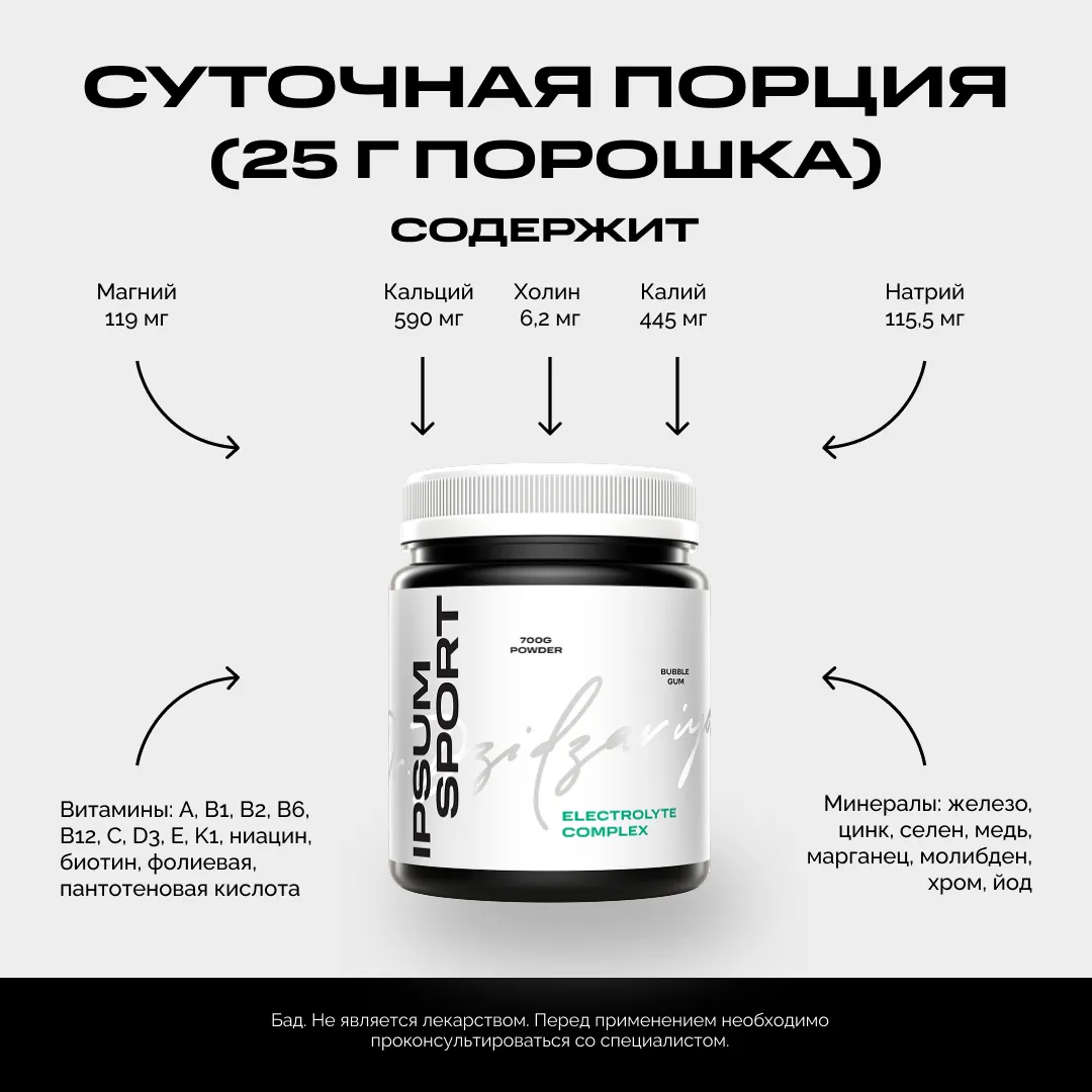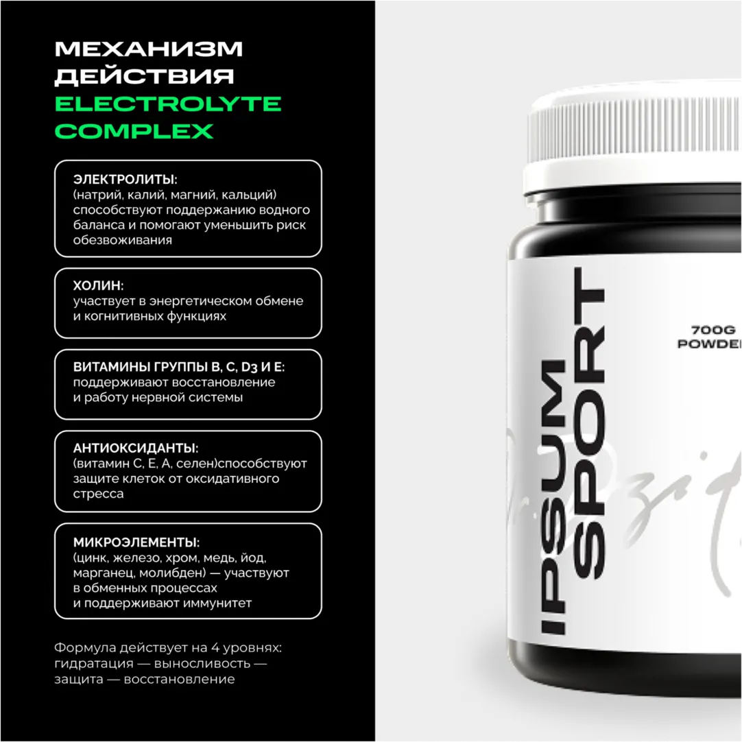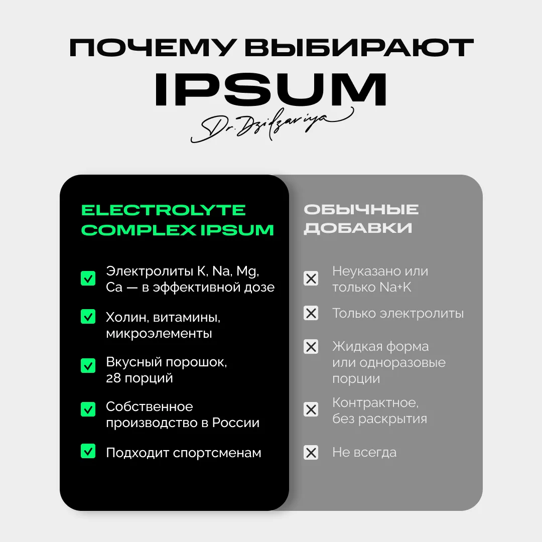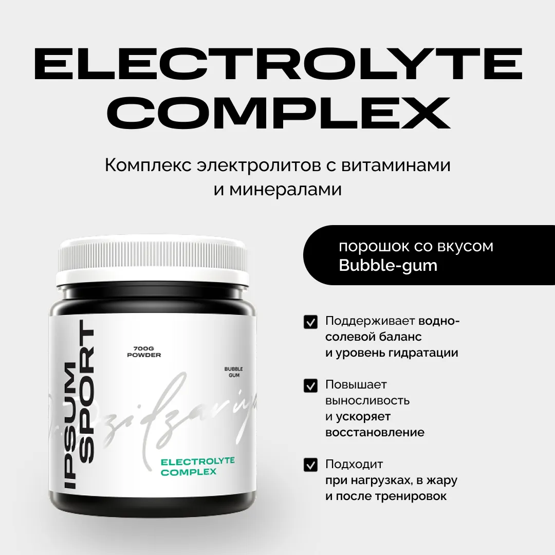 Каждая капля пота — это не только вода, но и минералы, которые отвечают за силу, выносливость и восстановление. Electrolyte Complex IPSUM — продвинутая формула, которая помогает телу удерживать баланс, работать на максимуме и быстрее возвращаться в ресурс после тренировки, забега или активного дня.