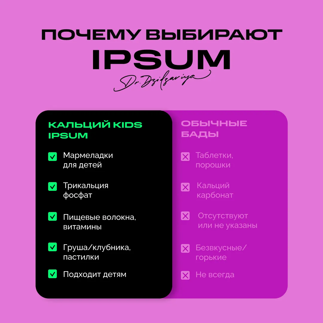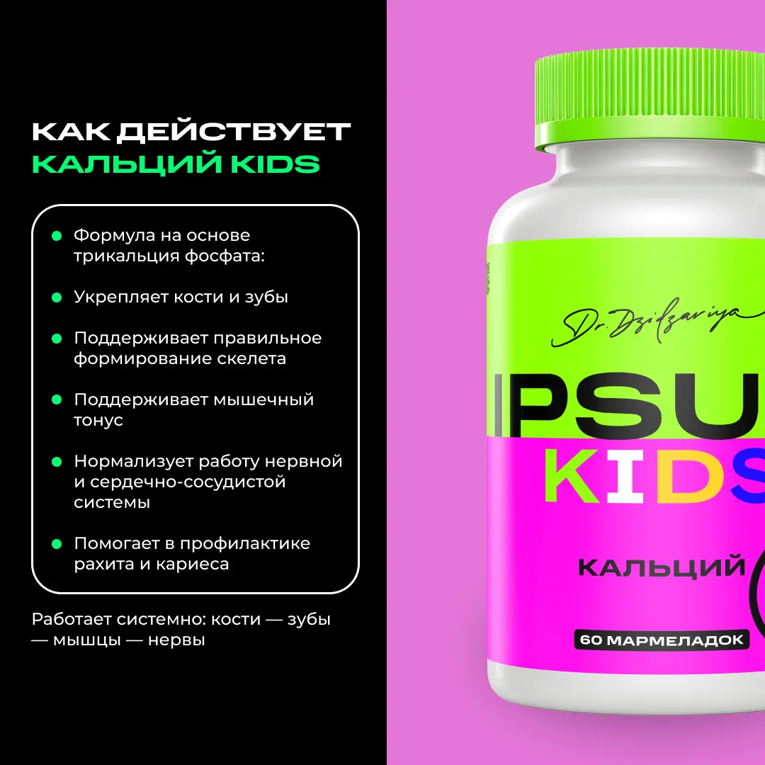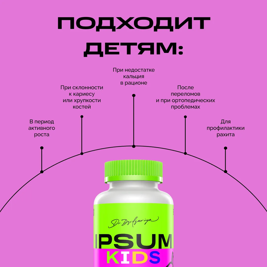 Рост — это настоящее строительство, и кальций здесь главный архитектор. Он укрепляет кости и зубы, помогает мышцам и сердцу работать как часы и создаёт основу для здорового будущего ребёнка. Детский кальций IPSUM — мягкий и вкусный способ дать растущему организму всё необходимое для крепкого скелета, активного тела и счастливых улыбок без кариеса.