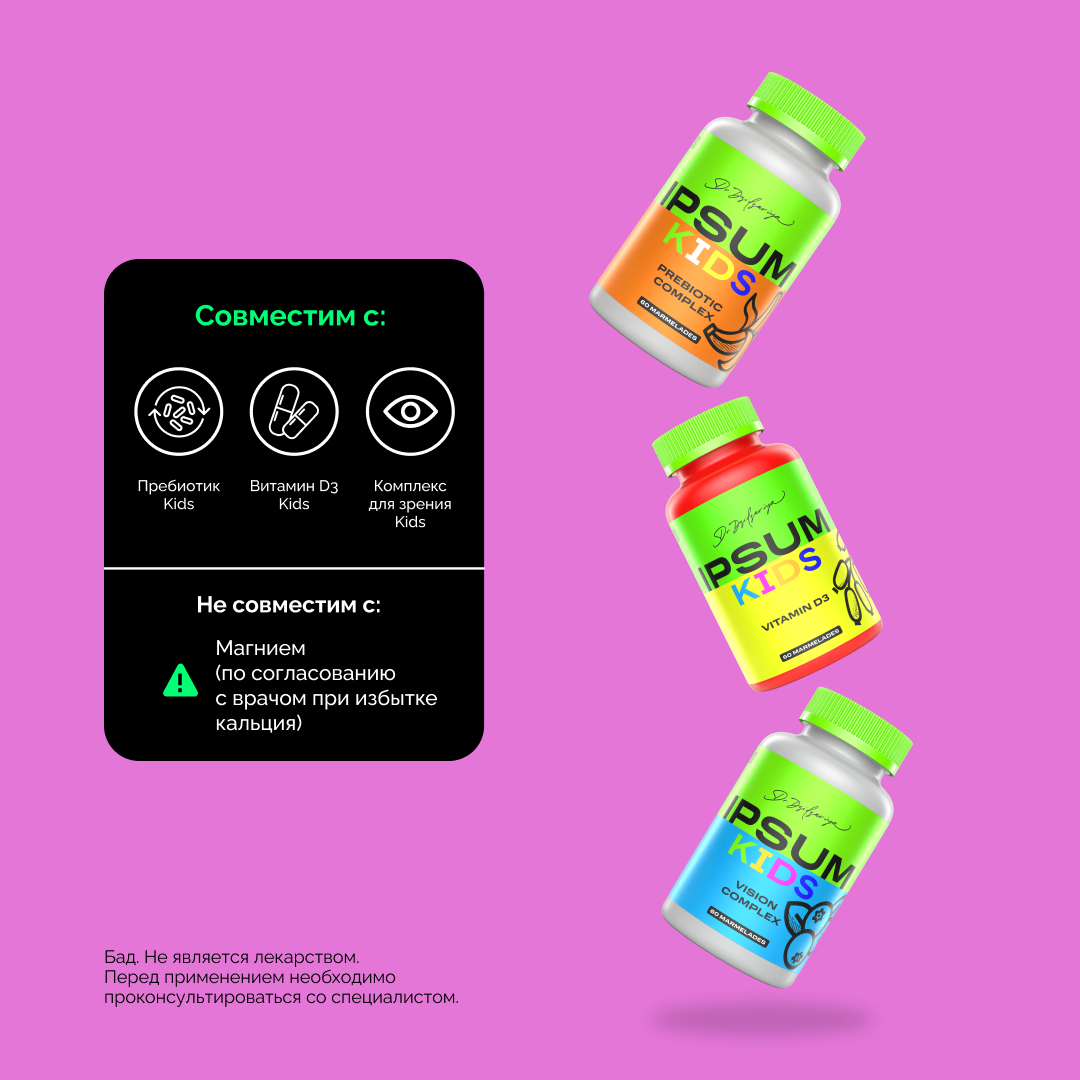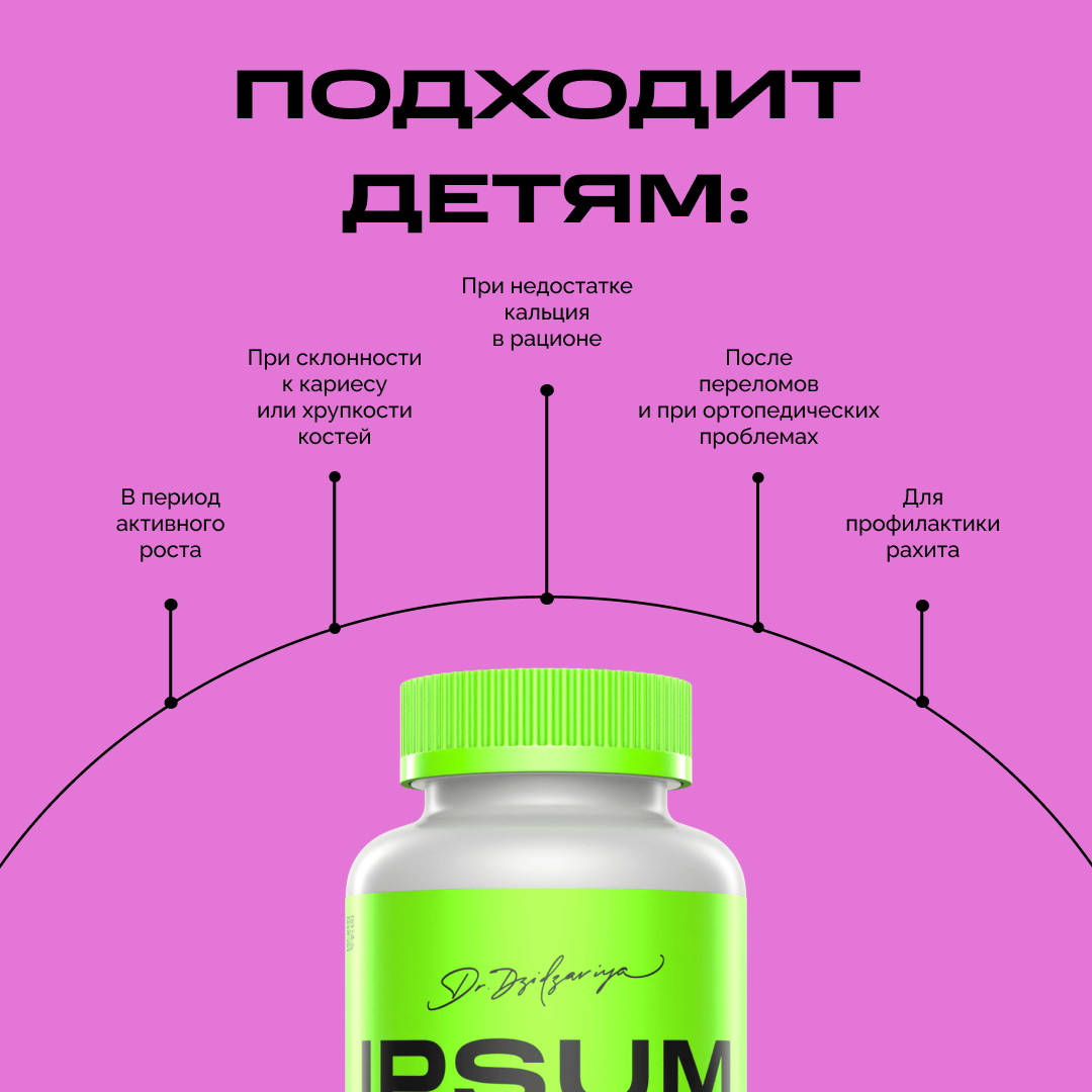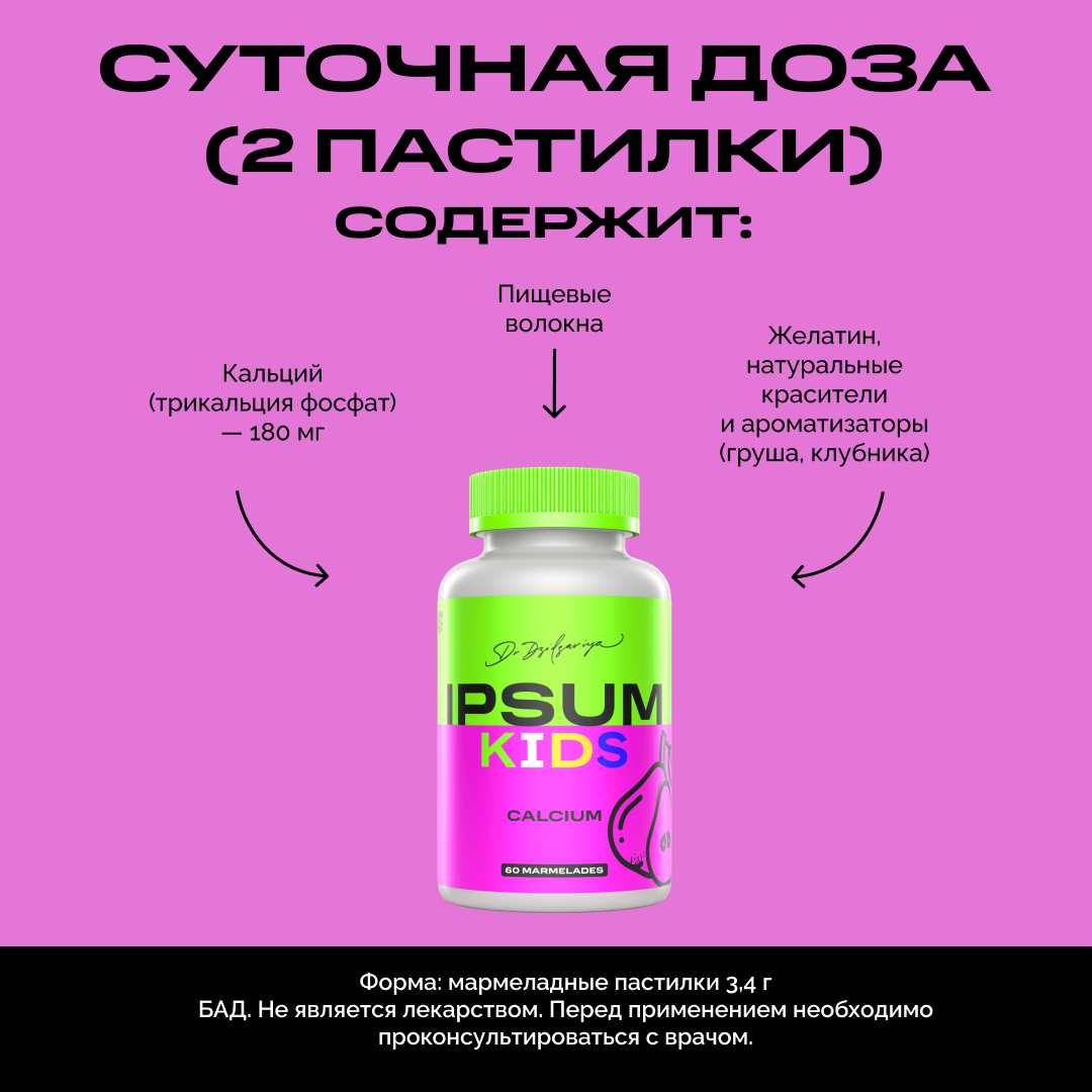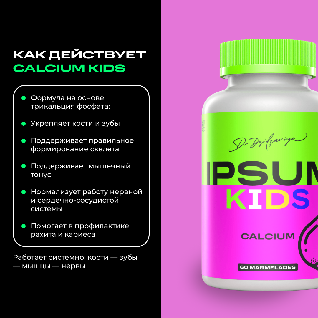 Рост — это настоящее строительство, и кальций здесь главный архитектор. Он укрепляет кости и зубы, помогает мышцам и сердцу работать как часы и создаёт основу для здорового будущего ребёнка. CALCIUM KIDS IPSUM — мягкий и вкусный способ дать растущему организму всё необходимое для крепкого скелета, активного тела и счастливых улыбок без кариеса.