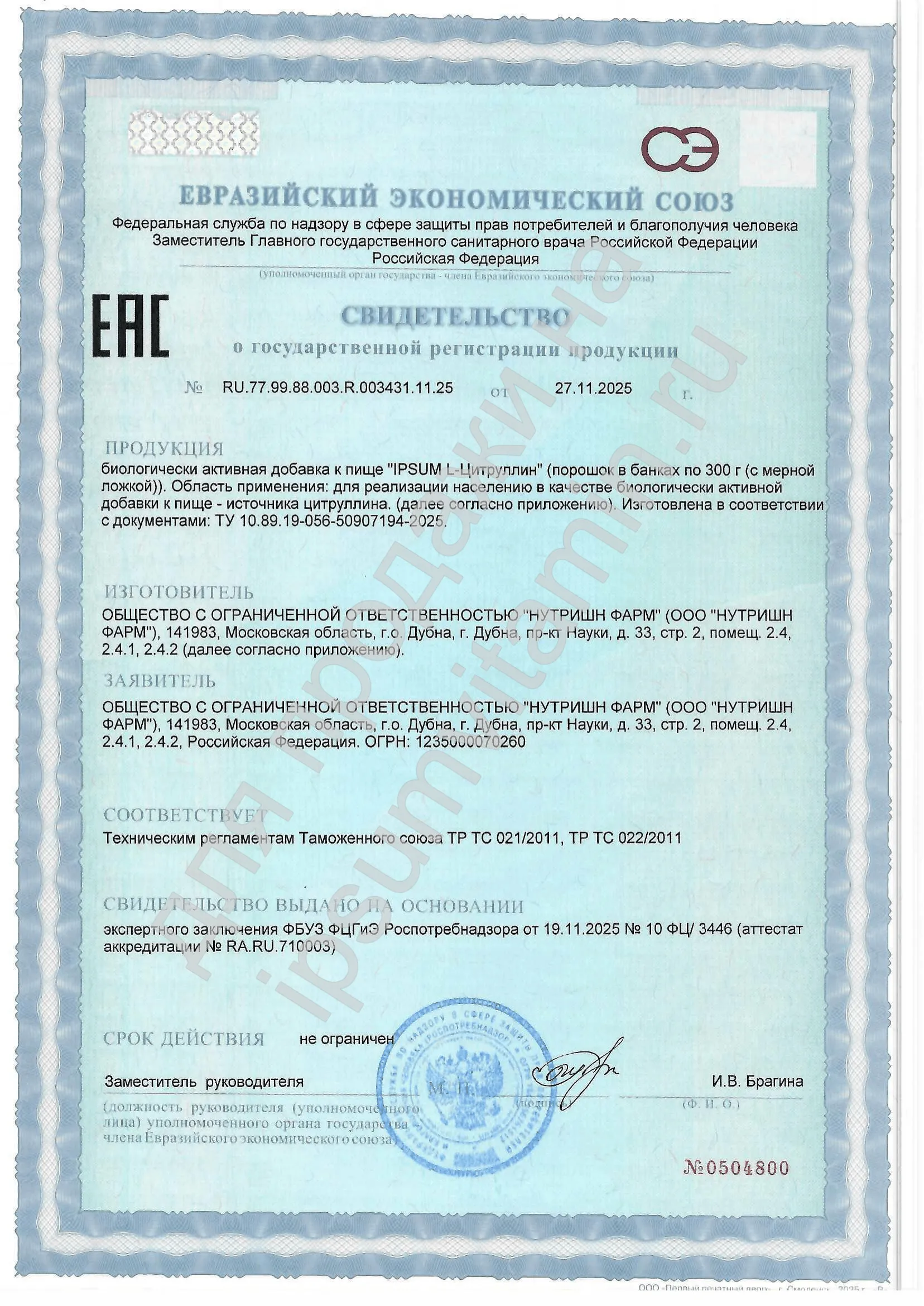 ** Не превышает верхний допустимый уровень потребления согласно “Единым санитарно-эпидемиологическим и гигиеническим требованиям к товарам, подлежащим санитарно-эпидемиологическому надзору (контролю) ТС ЕврАзЭС”, Глава II, Раздел 1, Приложение 5.