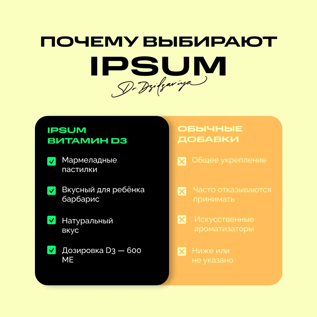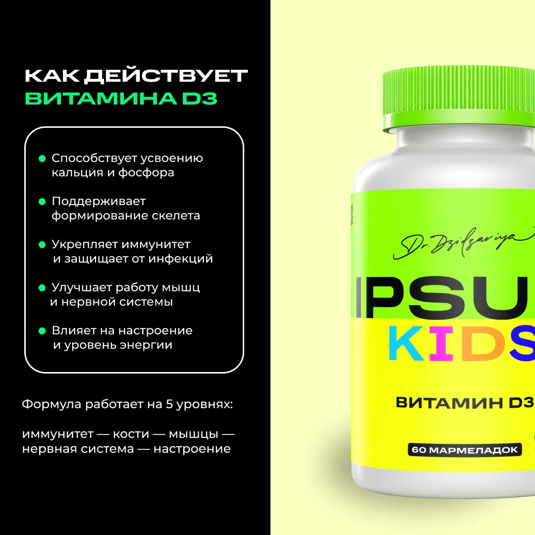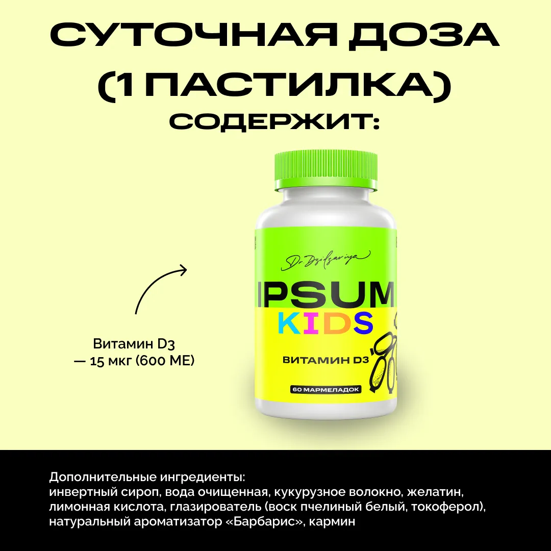 Витамин D — маленький, но крайне важный супергерой в питании ребёнка. Он отвечает за крепкие кости, здоровые зубы, сильный иммунитет и даже хорошее настроение. Детский витамин Д3 IPSUM создан, чтобы дать растущему организму поддержку, когда солнечных лучей мало или рацион не всегда идеален.