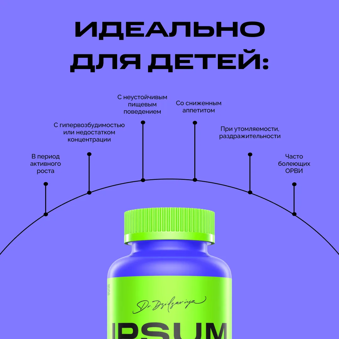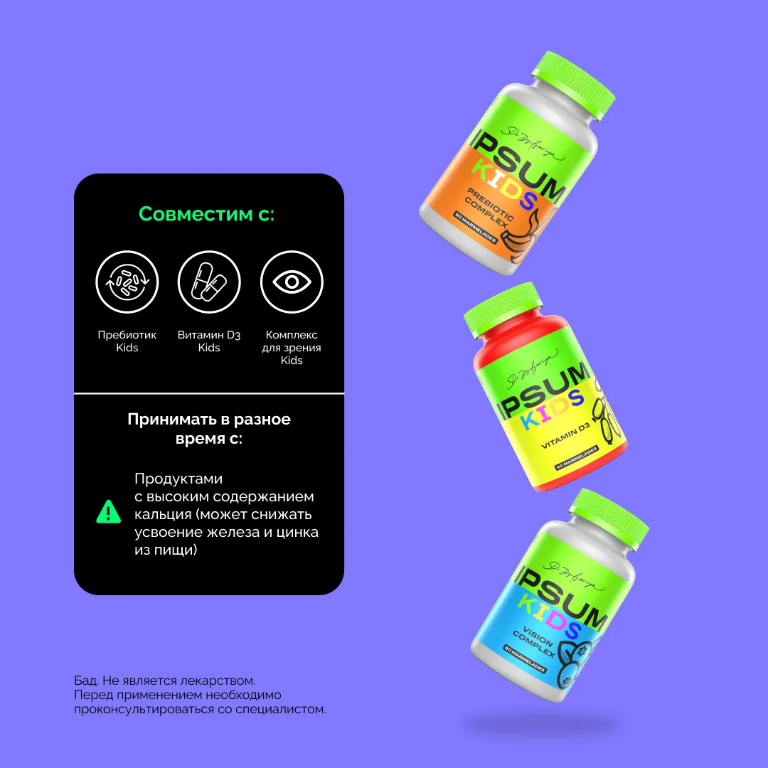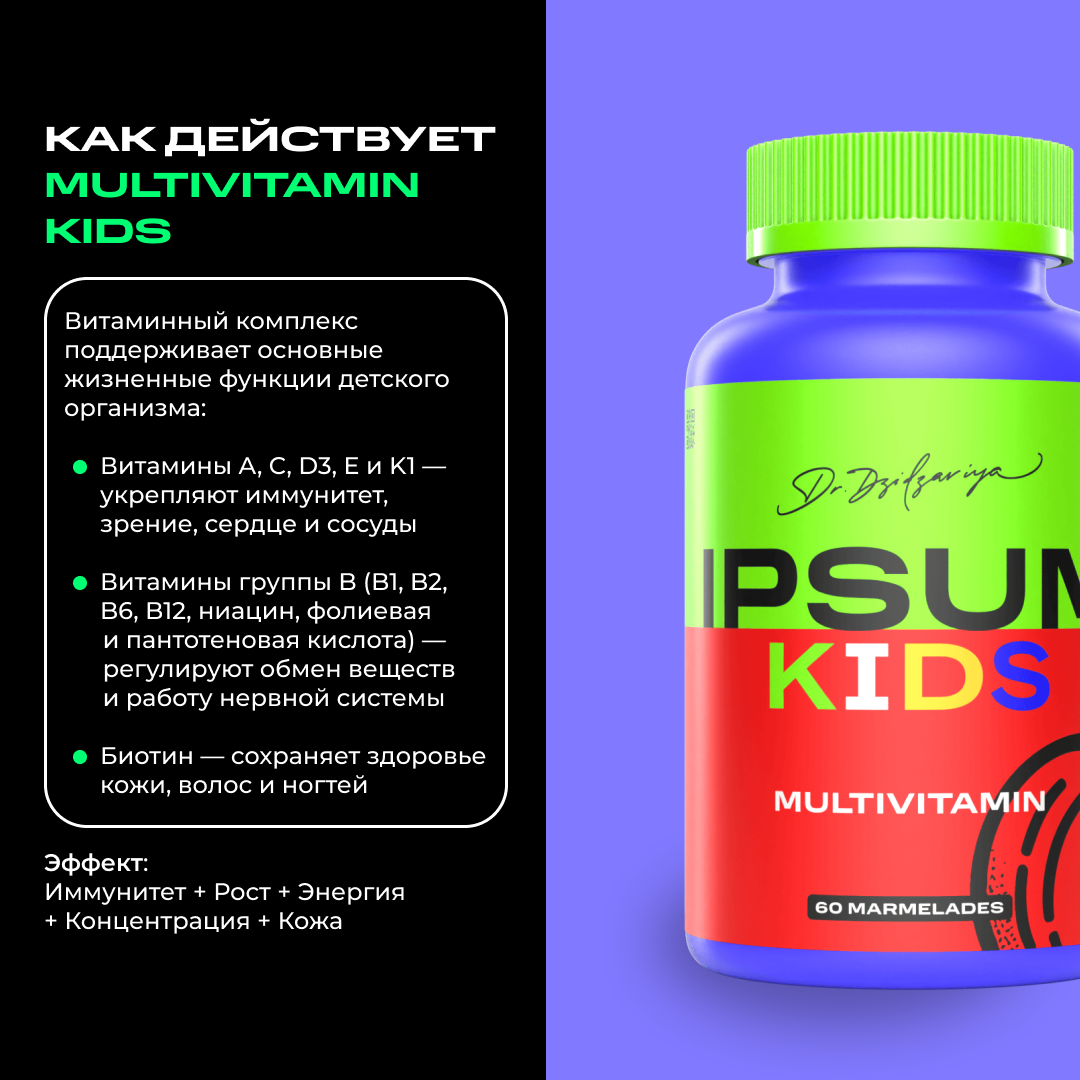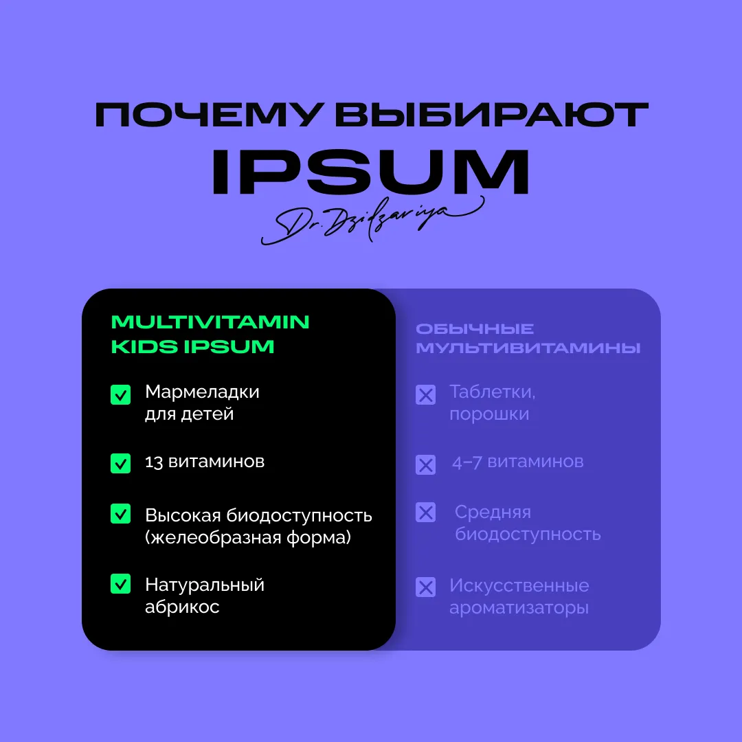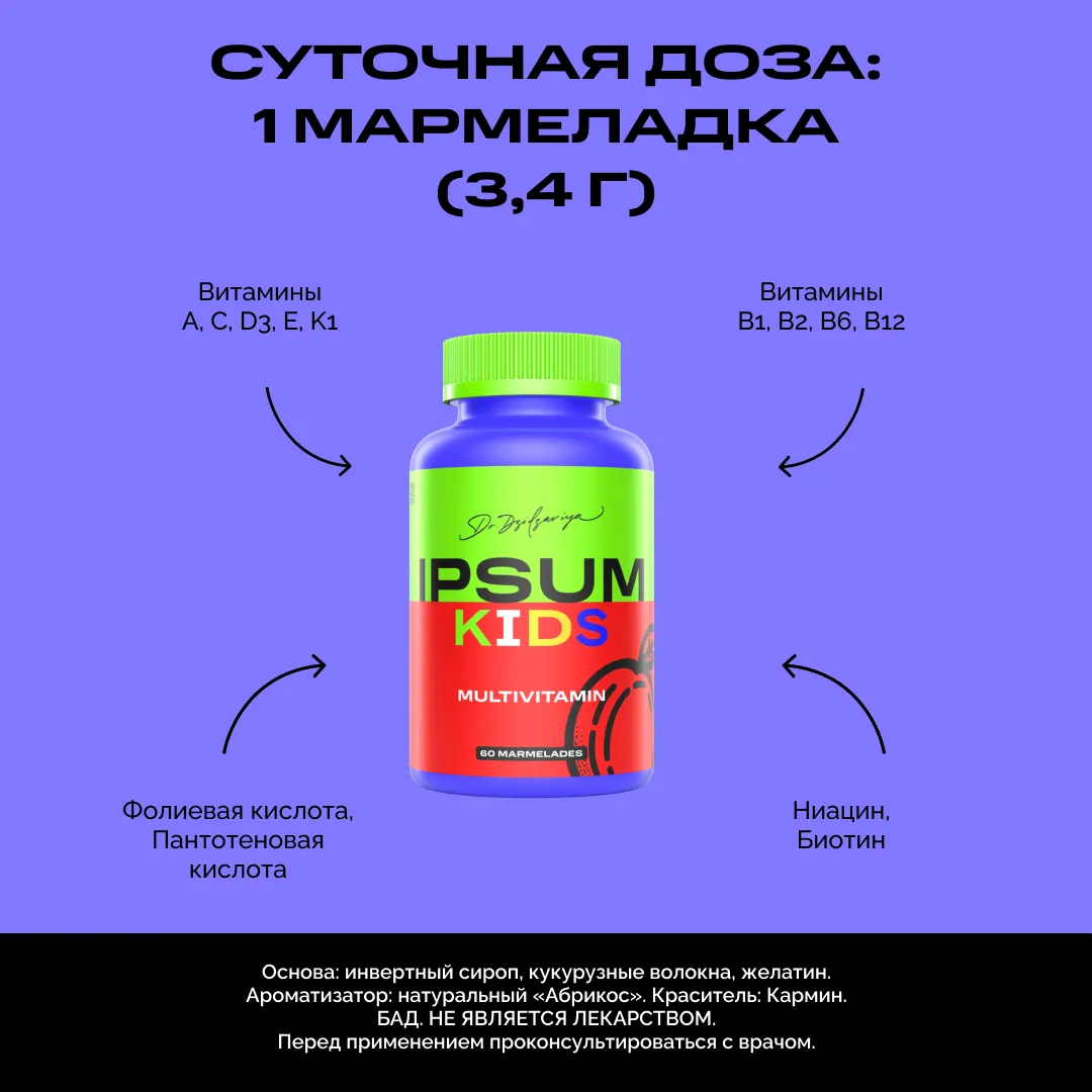 MULTIVITAMIN KIDS IPSUM — это витаминный комплекс в форме мягких мармеладок, которые дети любят, а родители ценят за богатый состав и настоящую пользу.
