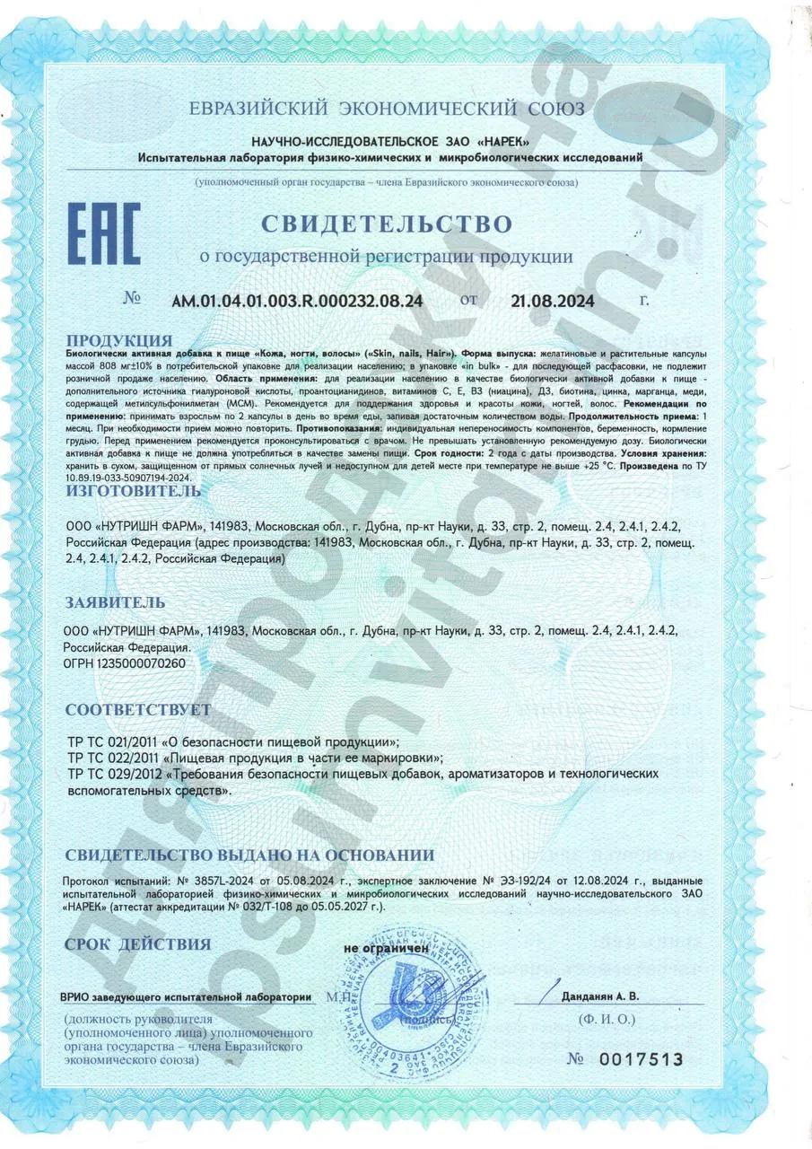 Принимать взрослым по 2 капсулы в день во время еды, запивая водой комнатной температуры. Такой приём помогает нутриентам лучше усваиваться и мягко включаться в естественные процессы восстановления кожи, волос и ногтей.