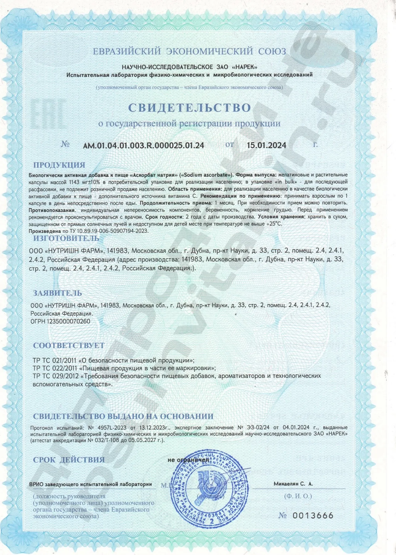Натрия аскорбат (Витамин С), капсула растительная (гидроксипропилметилцеллюлоза), мальтодекстрин.
