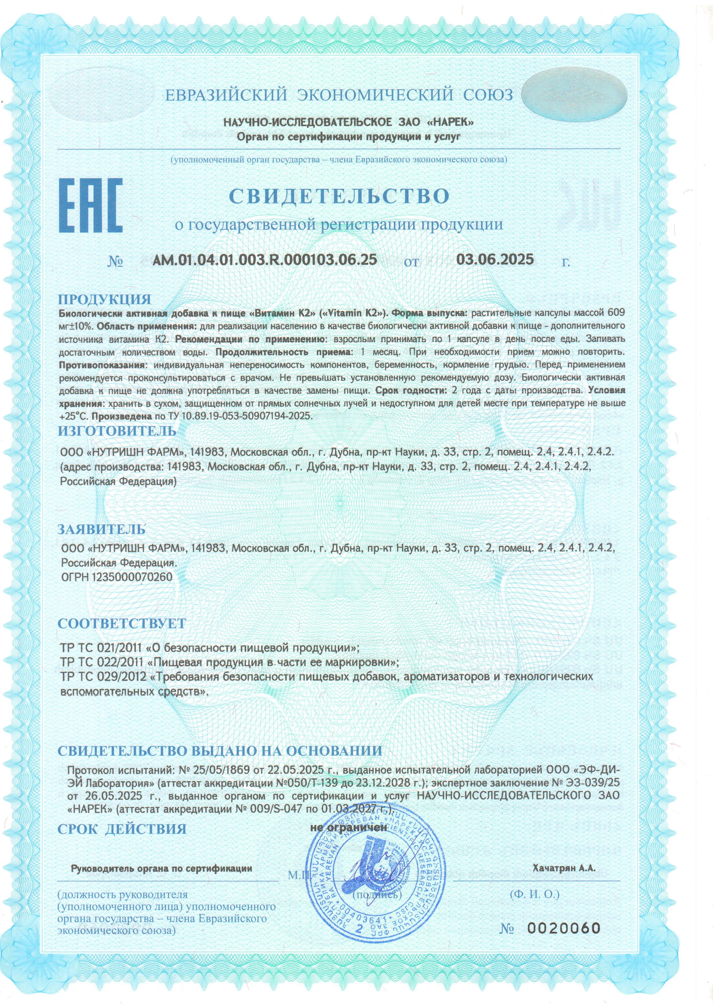 Участвует в обменных процессах организма, связанный со здоровьем костей, сосудов и свертываемостью крови. Также он играет важную роль в поддержании правильного баланса кальция и фосфора.