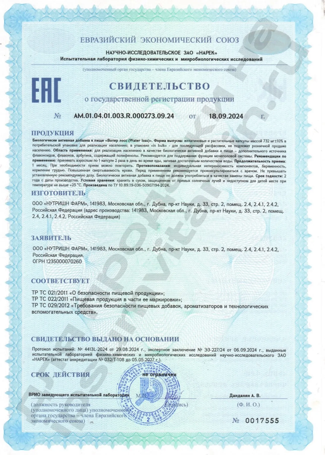 Принимайте по 1 капсуле 2 раза в день, во время еды, запивая стаканом чистой воды. Такой режим позволяет телу мягко и естественно поддерживать баланс жидкости в течение дня.